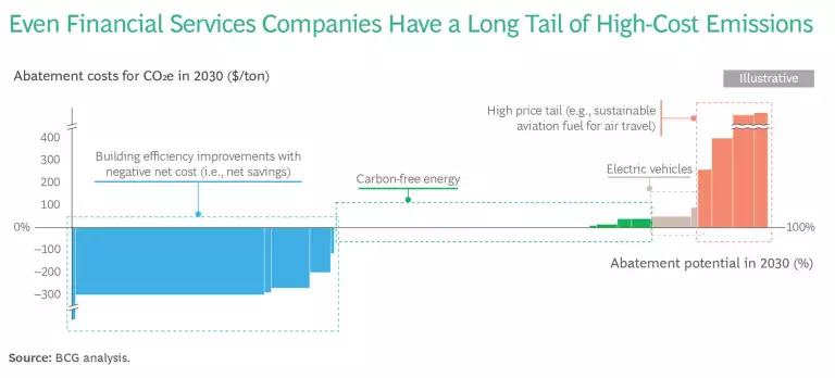 Consider the abatement challenge that a typical (hypothetical) financial services company faces. As the simplified abatement cost curve for Scope 1 and Scope 2 emissions in the exhibit illustrates, the company can achieve significant carbon and cost savings through building efficiency levers such as retrofitting heating, ventilation, and air conditioning systems and installing higher-energy efficient appliances (shown in blue). Reducing emissions by switching to carbon-free energy sources (shown in green) is roughly cost neutral, and reducing them by switching to electric vehicles has a small associated cost (shown in yellow). Pulling these three levers would enable the company to reduce about 90% of its emissions at a reasonable cost. But the remaining 10% of the company’s emissions (shown in red in the exhibit) are either impossible to abate or too expensive to abate without a significant negative financial impact on the business.