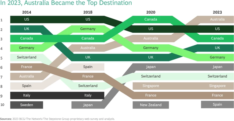 In 2023, Australia, which has been steadily rising through the ranks since we initiated this series, finally topped the list of desirable country destinations.