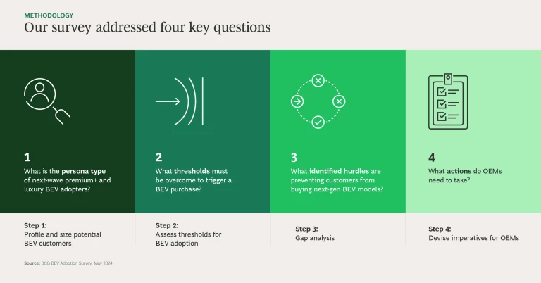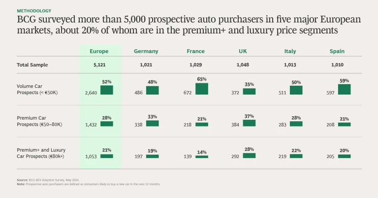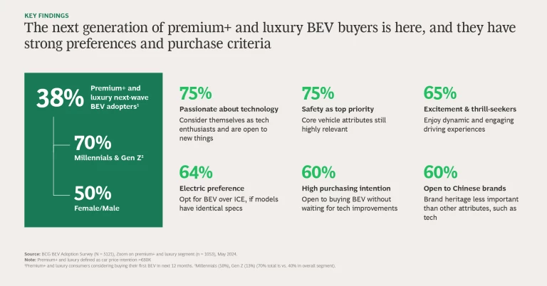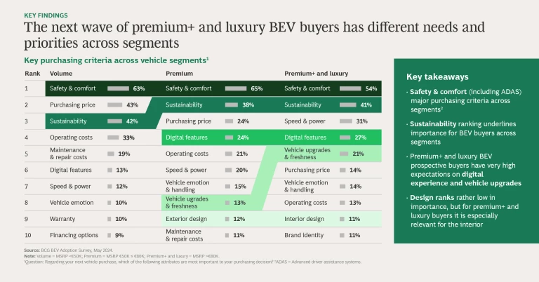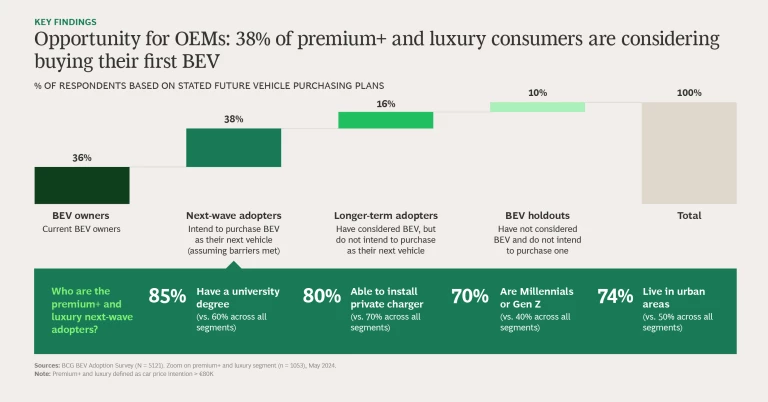 The news is not all gloomy, however. New BCG research shows that the number of potential premium+ and luxury buyers is growing, and many of these consumers, who have distinct preferences and strong views, are keen to explore BEVs. Manufacturers can (re)capture their interest—and a share of their wallets—if they listen closely to what these consumers want in a new electric car.
