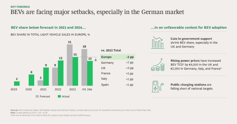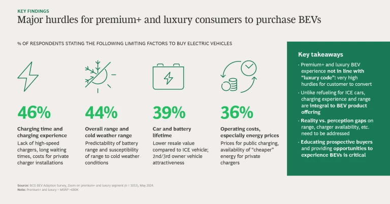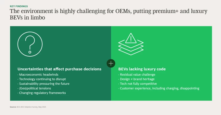 A combination of macroeconomic factors and tech disruptions slowed premium+ and luxury BEV sales. But OEMs’ product decisions contributed as well. Uncompelling tech, poor charging experience and range, low residual value, and vehicles that failed to live up to brand heritage all undermined the experience that consumers expect. Buyers voted with their feet and sent a clear message: If OEMs want to sell high-end electric vehicles, they must deliver the entire experience—including charging and acceptable range—in addition to powerful engines, extra-comfortable cabins, and sharp trim.