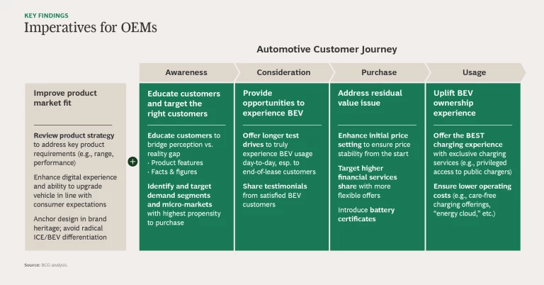 Tactics such as offering longer test drives to targeted purchasers (such as end-of-current-lease customers) so that drivers can experience true day-to-day BEV usage are key to building demand. Testimonials from satisfied BEV customers (delivered through the right channels) can also help.