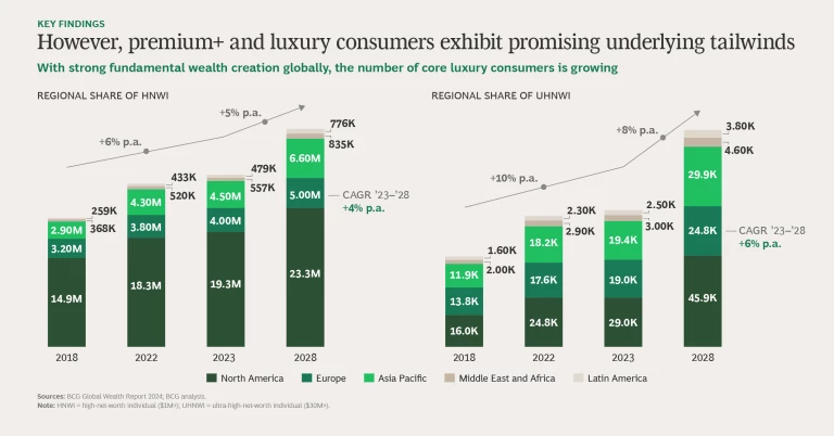 Our study included more than 5,000 consumers in France, Germany, Italy, Spain, and the UK. The roughly 2,500 respondents in the market for premium+ and luxury vehicles reveal the emergence of a new premium+ and luxury BEV buyer. They are gender-balanced (a 50-50 split, in fact). Millennial and Gen Z consumers account for 70% of prospective purchasers. These consumers are well educated (85% have university degrees), urban (75% live in cities), and ready to make a change from internal combustion engines (ICEs): 50% of all buyers and almost 40% of premium+ and luxury customers say they are likely to buy their first BEV in the next 12 months. This is an enormous opportunity for OEMs. Wealth creation is expanding, and the prevalence of high-net-worth households is increasing, in Europe and elsewhere.