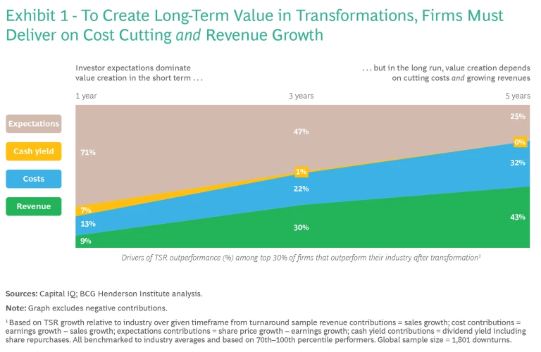 Our analysis shows that, in the short term, investor expectations are the most significant driver of value creation in a transformation contributing more than two thirds of TSR outperformance over industry peers in the first year after a transformation is initiated. (See Exhibit 1). Efficiency improvements drive 13% of the outperformance, while the remaining factors (revenue growth and margin improvements) play even smaller roles.