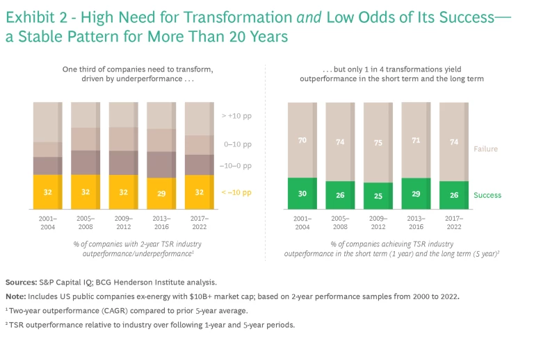 The empirical patterns of transformation are quite stable: At any point in the past 20 years, roughly 30% of companies significantly underperformed their sector for a period of multiple years, making transformation a necessity for performance reasons.