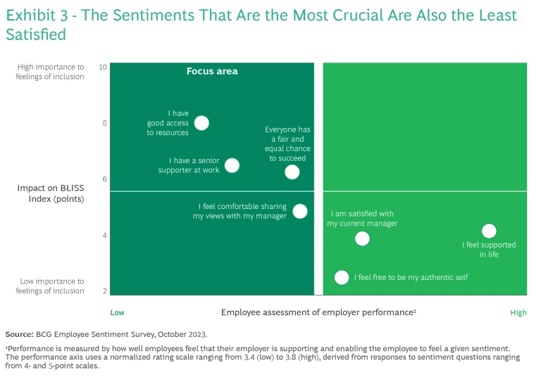 These sentiments are positioned nearest to the top left corner of the exhibit, indicating high importance but low employer performance in delivering the necessary support. (Performance is determined by employee assessments of how well their employer is providing for a need.) These results show significant opportunities to improve inclusion.