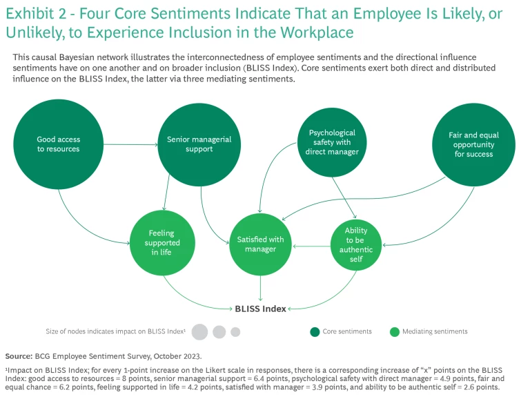Bayesian network mapping of these sentiments lets employers see how the four core sentiments are connected and how they lead to feelings of inclusion. Focusing on the core sentiments gives leaders a place to start when developing targeted interventions. (See Exhibit 2.) By concentrating on the high-impact upstream sentiments—such as feeling safe when sharing thoughts with a manager and feeling that everyone at the company has a fair and equal chance—leaders can also influence downstream sentiments and inclusion in an efficient way.