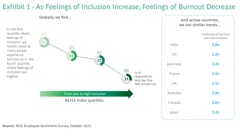 That’s because our research has revealed that burnout—which has historically been considered a consequence of long hours, a physically demanding job, or a high-stress environment—is also highly correlated with low feelings of inclusion. Essentially, employees who are more burned out feel less included at work.