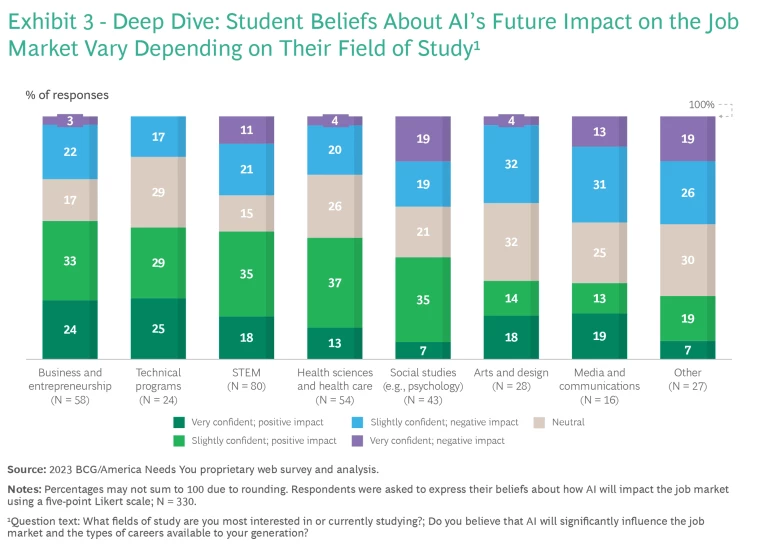 Broken out by field of study, students studying business/entrepreneurship, technical fields, and STEM were the most positive about the benefits of AI to their fields, while students in social studies, arts and design, and media and communications had a more negative outlook (see Exhibit 3).