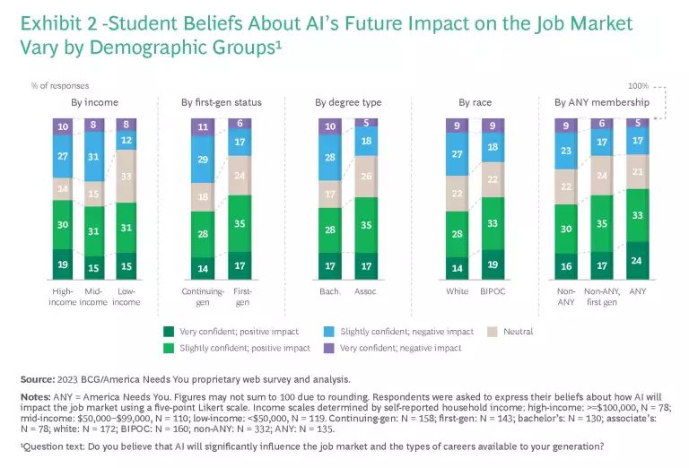 Despite these concerns around career preparedness, students were generally positive about the influence of AI on the job market for their generation. More disadvantaged groups, however, tended to be less sanguine. (see Exhibit 2).