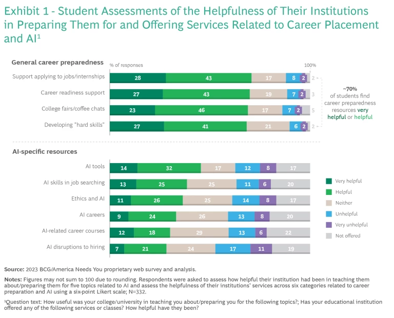 Currently, students find AI-specific resources for career preparedness less helpful than general career preparedness supports. Only 29% of respondents reported that their institution’s offerings on “AI disruptions in hiring” were helpful or very helpful, compared with the 70% who said their school’s “support applying to jobs/internships” was helpful or very helpful (see Exhibit 1).