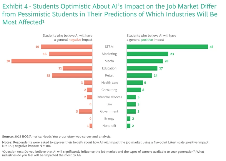 Regardless of whether they had a positive or negative outlook, students typically agreed that STEM, marketing, and media industries would see the biggest impact from AI (see Exhibit 4).