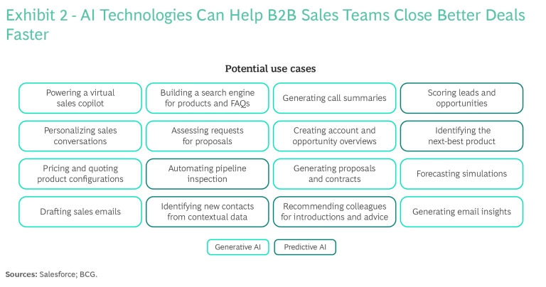 Across industries, AI—in both its generative and predictive forms—is a powerful catalyst for operational efficiency, enhanced customer experiences, and growth. But for the telecom sector, its reach is particularly broad, turbocharging all aspects of the business, including marketing, support, and network optimization. To spotlight the ground that GenAI and predictive AI cover in B2B sales, BCG and Salesforce have developed a set of use cases. (See Exhibit 2.) It’s not an exhaustive list, and many more use cases will come, but it underscores the power of AI technologies to simplify, automate, and propel an array of processes and interactions.