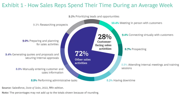 For telecom companies, the excitement around generative AI isn’t quite at Swiftie levels, but it’s getting close, and here’s a reason: GenAI promises to put the sales back in sales teams. This is especially appealing to the B2B sector, where sales representatives spend the bulk of their time—72%, according to a study by Salesforce—on tasks other than selling. (See Exhibit 1.) The beauty of GenAI is not only that it lets sales reps spend more time with prospects and customers but also that it makes those interactions more personal and more productive than ever before.