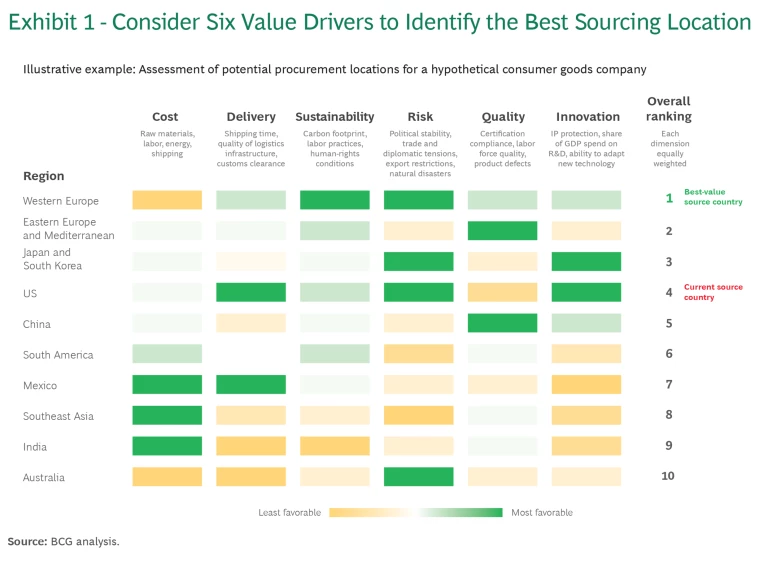 When choosing a location (or locations) to source from, we suggest that companies move from the traditional, best-cost approach to a best-value approach that incorporates broader considerations. This requires a holistic assessment of locations and supplier relationships. Buyers should develop a scorecard that considers six sourcing value drivers. (See Exhibit 1.)