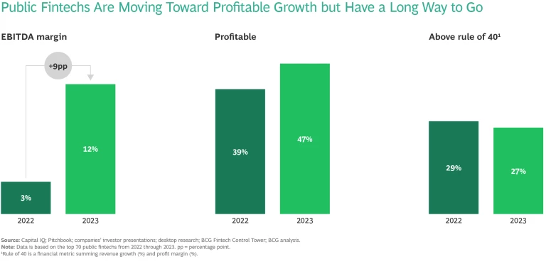 However, we believe these challenges are part of the short-term correction—a tempering of investor enthusiasm—that we discussed in last year’s report. Global fintech revenues have continued to grow at a robust clip: 14% over the past two years across the board, and 21% when crypto- and China-exposed fintechs are excluded. Perhaps more notably, the industry has initiated a shift toward profitable growth, with EBITDA margins improving by 9 percentage points on average. But this shift is still in its early stages, with the majority of the top 70 public fintechs still operating below the “rule of 40” threshold.
