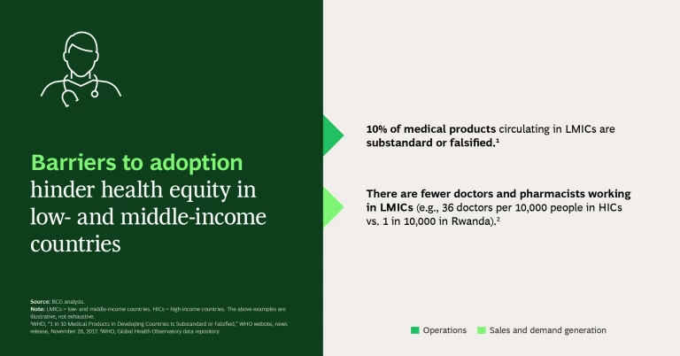 Barriers to Adoption. Adoption can be hindered because of health care worker shortages, national treatment guidelines that don’t include the drug, or limited awareness of the product’s availability. While high-income countries may also face barriers to adoption (as with vaccine hesitancy, for example), the health systems have very effective mechanisms to communicate with and educate patients whereas LMICs need to communicate through communities.