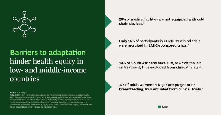 Although biopharma companies are strategizing new ways to enhance access to medicines, some 70% of R&D priorities for LMICs, including maternal conditions and infectious diseases, remain unaddressed. (See the exhibit.) Currently, drugs are six times more likely to be registered for regulatory approval in upper-middle-income countries than in LMICs.