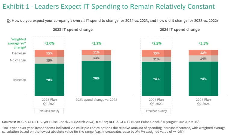 Those are some of the key takeaways from Boston Consulting Group’s latest IT Spending Pulse, conducted in collaboration with GLG, an insight network that provides access to expert perspective. (For last year's IT Spending Pulse, please refer to this link.) The survey was conducted during Q1 of 2024 and captures insights from 330 IT buyers at the director and senior director level or higher. The respondents span industry verticals, with 66% coming from North America and 34% from Europe. (See the sidebar on separate Asia-Pacific data.) The IT Spending Pulse focuses on large (greater than $1 billion in revenue) and midsize companies, with approximately 60% of respondents leading IT spending at large enterprises and 40% holding roles at midsize companies.