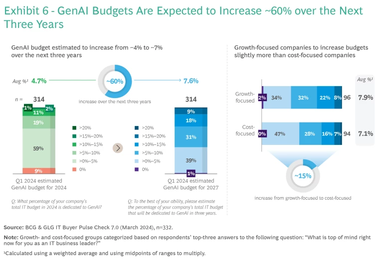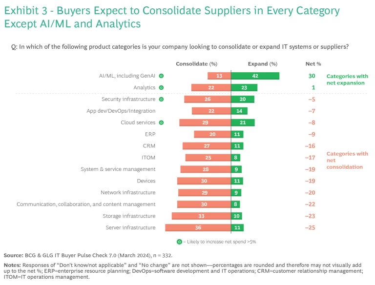 The clear outlier in this consolidation trend is AI/ML. About 42% of respondents plan to expand vendors, while just 13% expect to consolidate, as companies explore the many GenAI products coming to market. (See Exhibit 3.) At the same time, spending on GenAI is increasing. GenAI accounts for ~4.7% of a company's IT budget on average in 2024, and over the next three years companies expect spending to grow 60% to account for ~7.6% of IT budgets on average.