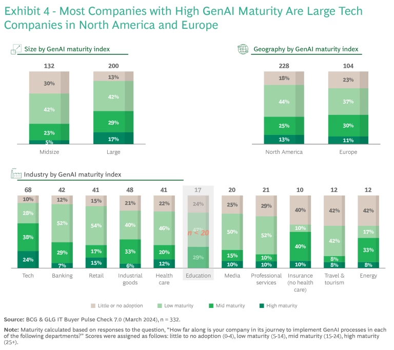 When looking at adoption by company size, large companies are significantly more likely to be mature, with 46% having mid or high maturity and only 13% in the no-adoption category. Midsize companies are much less mature, with more than 70% reporting low or no GenAI adoption.