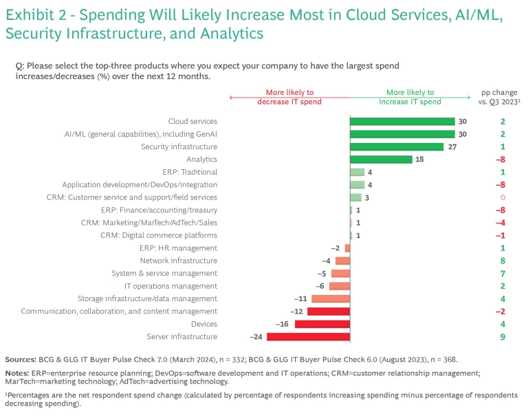 Interestingly, while spending on analytics, app development, and enterprise resource planning for finance is still positive, their rates of growth declined sharply from Q3 2023—potentially due to the increased focus on cloud and infrastructure. Meanwhile, respondents expect the largest net spend decreases to occur in server infrastructure (24%) and devices (16%).