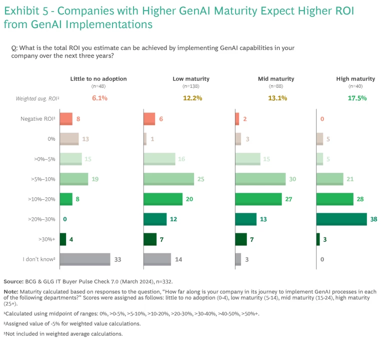 Two important metrics became clear in our examination of the data. First, companies with high GenAI maturity estimate ROI three-times higher over the next three years, compared with companies with little to no GenAI adoption (18% versus 6% ROI). Second, 38% of high maturity companies expect ROI of 20%-30%, and just 3% expect more than that. By comparison, only about a third as many low and mid maturity companies expect 20%-30% returns, yet twice as many expect more than 30% returns. (See Exhibit 5.)