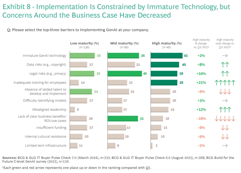 Among high maturity companies, other areas causing implementation challenges include data risks, legal risks, and inadequate training, which have increased 8%, 10% and 21%, respectively, since the Q3 2023 survey. Interestingly, high maturity companies perceive fewer business risks (down 16%) as use cases and ROI become more clear—another indication GenAI investments are yielding concrete results, giving companies confidence to move forward. At the same time, respondents cited “misaligned leaders” as a growing problem—perhaps because of functional interdependences and the difficulty scaling up GenAI use cases. (See Exhibit 8.)