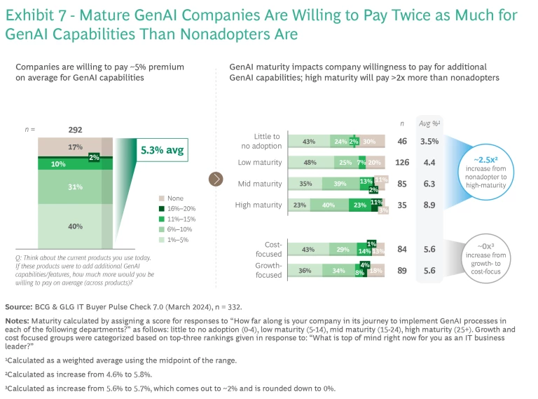One reason high maturity companies might be going over budget—and another sign of their faith in the technology—is their willingness to pay more for additional GenAI capabilities on current software products (see Exhibit 7). Those companies are prepared to shell out ~9% more, on average, which is significantly higher than what the average company is willing to pay (~5% more).