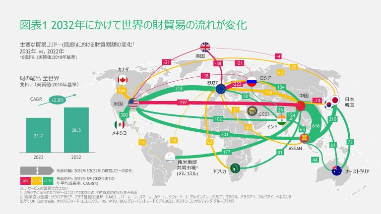 世界経済が持続する経済的・地政学的な秩序の変化に適応していく中で、世界の貿易地図を定義してきた馴染みのルートが描き直され、地域貿易圏がより大きな役割を果たすようになっている。加えて、世界貿易全体の成長率は世界経済の成長率を下回ると予想される。これは、冷戦の終結以降世界が享受してきた、貿易主導のグローバリズムの流れが転換期を迎えていることを意味する (コラム「BCGグローバルトレードモデル」についてをご参照ください)。 BCGの今回の分析によれば、2032年までの10年で、世界の財貿易は年平均2.8%で成長すると予測されるが、同期間の世界GDPの成長率はこれを上回る3.1%と推定されている(図表1)。