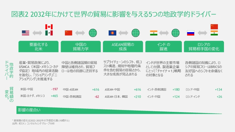 地域貿易圏の出現、台頭により、中国-米国間、中国-EU間のような、これまで急成長してきた伝統的な貿易ルートには陰りが見えてくると予想される。今後10年間は以下に挙げる5つの地政学的ドライバーが世界貿易を形作ると考えられる(図表2)。