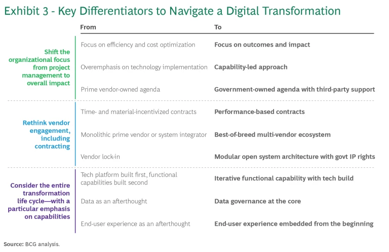 Conversely, governments that take a proactive approach—applying the differentiators we identified and relying on an objective, third-party navigator—can ensure that their digital transformation stays on schedule and on budget and leads to strong capabilities. In that way, they can better position themselves to meet the needs of their stakeholders.