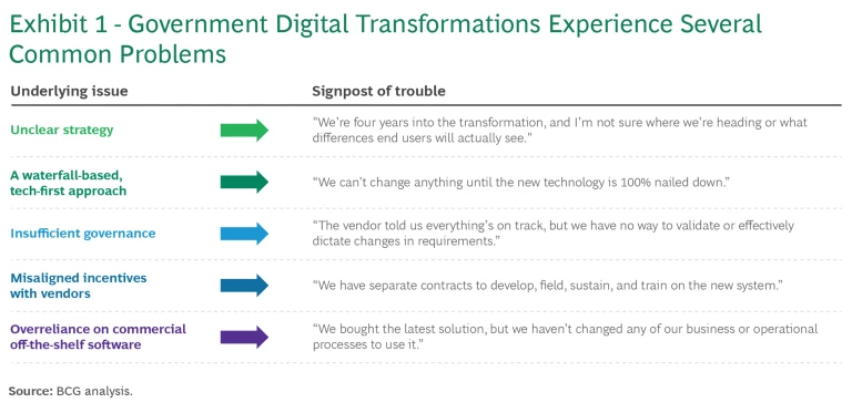 Based on our experience supporting government transformations over the past ten+ years, BCG has determined that there are several underlying issues that cause large-scale digital transformations in government agencies to go off-track. These include a waterfall-based, tech-first approach, insufficient governance, and an unclear strategy, among others. (See Exhibit 1.)
