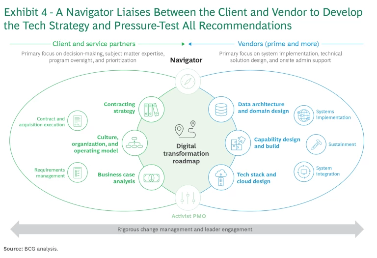In many cases, we’ve seen the government leverage an objective third party—a navigator—to enable the differentiators above and help implement a digital transformation. A navigator isn’t an individual, but rather a team of product managers, IT architects, program-specific subject matter experts, and user-experience designers. Collectively, this group serves as a trusted advisor to the government and as a liaison with vendors, bringing the right stakeholders to the right conversations at the right time to ensure better outcomes. (See Exhibit 4.)