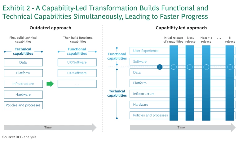 In addition to table-stakes measures, government entities should ensure that a transformation achieves its main objective: building new capabilities for an organization. Rather than a linear, gated process, this often means an iterative approach that addresses people, processes, tech, data, and systems simultaneously to build capabilities incrementally over time. (See Exhibit 2.)