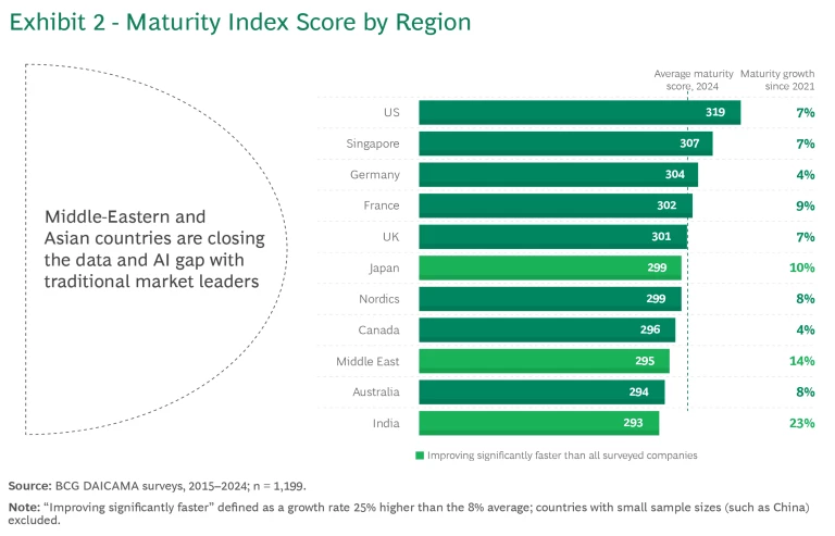 In terms of geography, the US is the top performer—as it was in all previous surveys—with a 7% increase in the average maturity score of companies surveyed since 2021. (See Exhibit 2.) Singapore passed Germany to grab the number-two spot, while Indian companies surged 23%, almost knocking Australia out of the top ten.