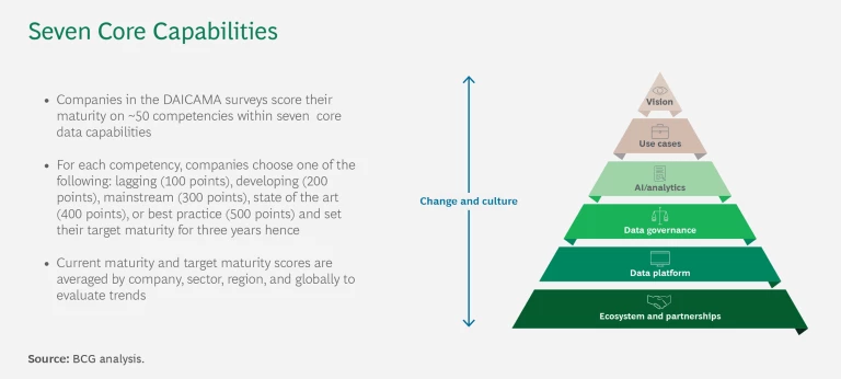 As shown in the second exhibit, below, we conceive of the seven core capabilities as a pyramid surmounted by a company’s vision for data and AI. Each of the remaining six capabilities is informed by those above it, with “change and culture” cutting across all seven to ensure organizational alignment every step of the way, from use cases to ecosystems and partnerships.