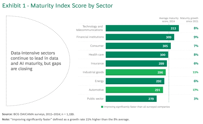 While these maturity rankings by sector and geography have not changed much since the 2021 survey, an important takeaway is that the maturity gaps are closing. That’s good news, although it also means that competition for scarce data and AI talent is likely to become intense.