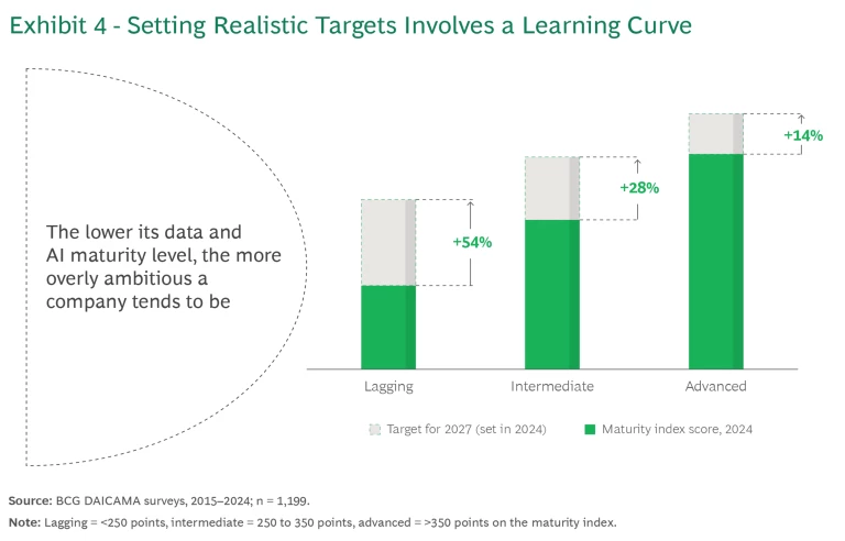 It appears that as companies put more effort into building data and AI capabilities, they develop a better understanding of the challenges involved and set more realistic targets as a result. One sign of this acquired wisdom is that the most mature companies aim to achieve maturity growth rates just slightly above the global average. In contrast, the least mature companies with the least experience in building those capabilities regularly aim for extremely rapid maturity growth. (See Exhibit 4.)