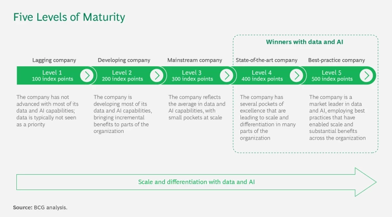 Of course, it’s not impossible for companies with low levels of maturity to achieve such aggressive ambitions. With data and AI becoming more generalized, and with more mature services and products available, companies may now be able to move faster than companies that started earlier. Still, they should take care not to set ambitions that will frustrate the organization. If a company promises its employees that data and AI will make their lives easier and those promises aren’t realized, they are likely to lose confidence in the entire data transformation journey.