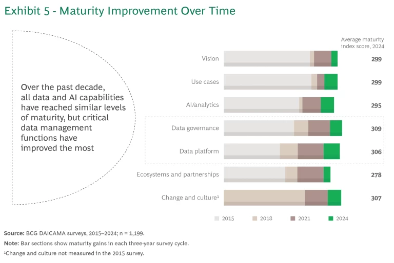 Another sign of the wisdom companies have acquired is that they are now focusing on improving all of the assessment’s data and AI capabilities. (See Exhibit 5.) Over the past decade, companies have come to recognize the interdependence of these capabilities in unlocking the full value of data. They have realized that they can only be as strong as their weakest link and have worked to bring all seven capabilities to equivalent levels of maturity.