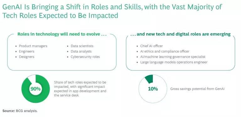 For the vast majority of tech jobs, roles and skills will change as employees increasingly incorporate GenAI into their processes and workflows. For example, data scientists will need to work with greater volumes of unstructured data to train large language models (LLMs) and generate insights.