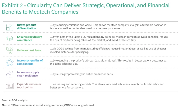 And on the business side, medtech firms that choose circularity can realize benefits such as product differentiation, cost reduction, and improved product quality and enhanced features at same price point per use (see Exhibit 2).