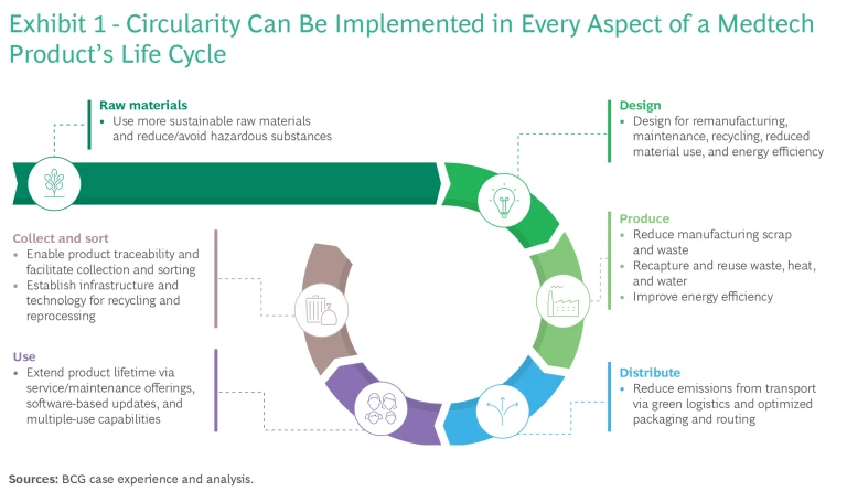 Circularity is a shift from the linear model of “take, make, waste” to a business ethos of “reduce, reuse, recycle.” To make this transition, medtech companies need to consider changes across the entire product life cycle—from raw materials through design, production, distribution, product use, and product end of life (see Exhibit 1).