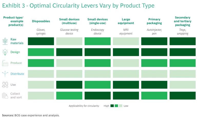 The waste reduction potential varies as well by product type. For instance, surgical gloves made of biobased materials eliminate all plastic waste, refurbished MRI machines or a reengineered glucose monitoring system cut waste by more than 50%, and product miniaturization diminishes waste by 10% to 50%.