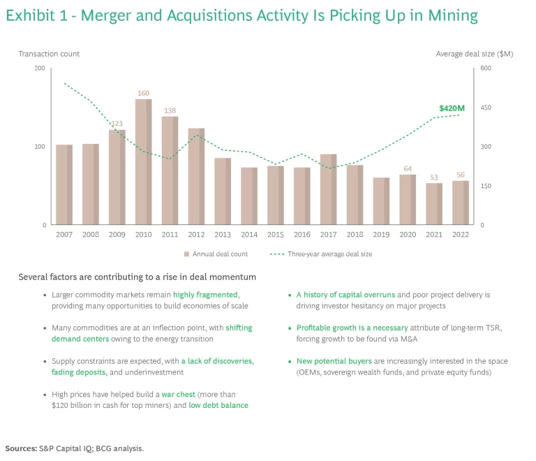 Finally, M&A is set to gather momentum across mining, fueled by several converging factors. (See Exhibit 1.) As leaders assess promising targets, they need to have confidence that such acquisitions will be value accretive amid this uncertainty.