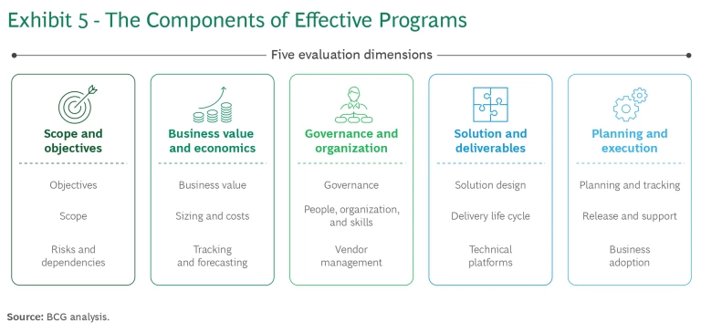 BCG’s assessment framework for large-scale tech programs, which our clients have followed successfully for the last decade, covers 15 areas of evaluation along five major dimensions. (See Exhibit 5.) Two of the dimensions—scope and objectives and business value and economics—are crucial to good program design and value creation. The other three—governance and organization, solution and deliverables, and planning and execution—determine successful execution and minimize value erosion.