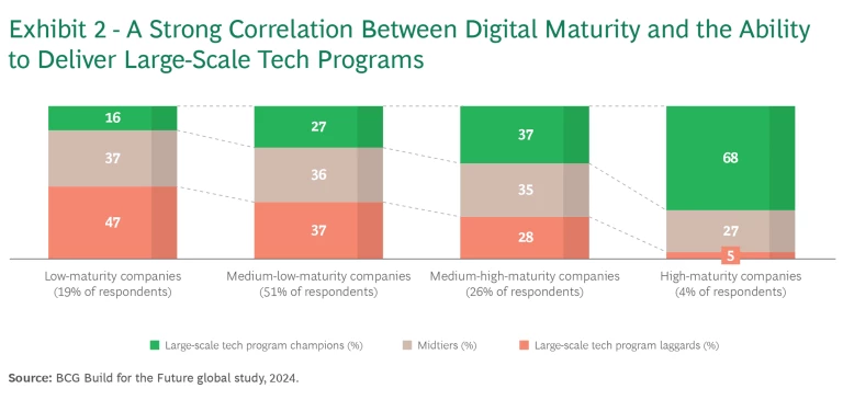 Companies with high digital and AI maturity implement large-scale tech programs significantly faster. They also are much more likely than others to stay within budget and exceed the program’s planned scope. (See Exhibit 2.) On average, more than four out of five program champions deliver on time and on budget. Only 5% fall short on scope. The programs of more than 85% of champions exceed their initially planned scope, 41% are completed faster, and 27% cost less than expected.