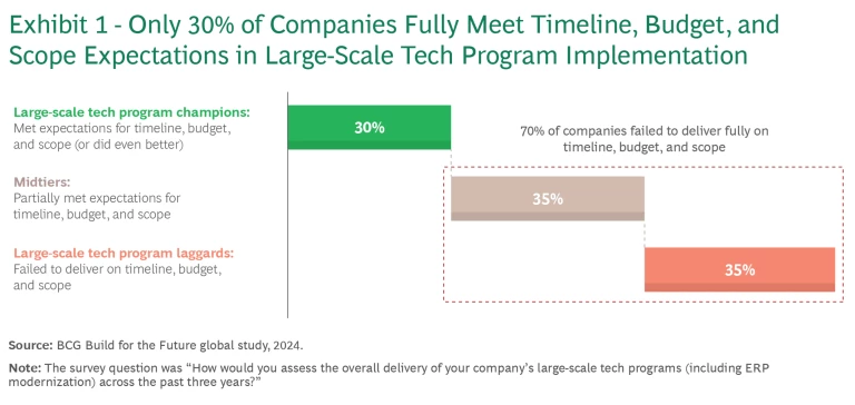 Large-scale program implementation remains a routine responsibility of corporate IT departments. But delivering these tech programs is a challenge for most companies. Only 30% of them—companies we call large-scale tech program champions—fully meet expectations for timeline, budget, and scope. (See Exhibit 1.) Another 35%—the large-tech program laggards—fail to deliver across all criteria, and the rest meet some criteria while falling short elsewhere.