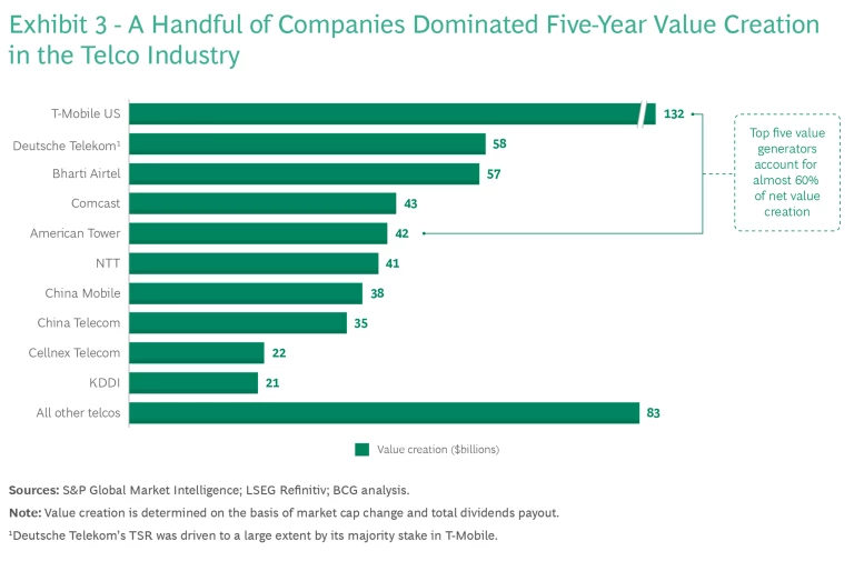 Dividends are a key factor in the mix. From 2019 to 2023, dividend payouts totaled $485 billion, 85% of the net value creation. In contrast, telcos created just $87 billion in value through increases in market capitalization, and more than 40% of them ended the five-year period with a smaller market capitalization than they had at the beginning.