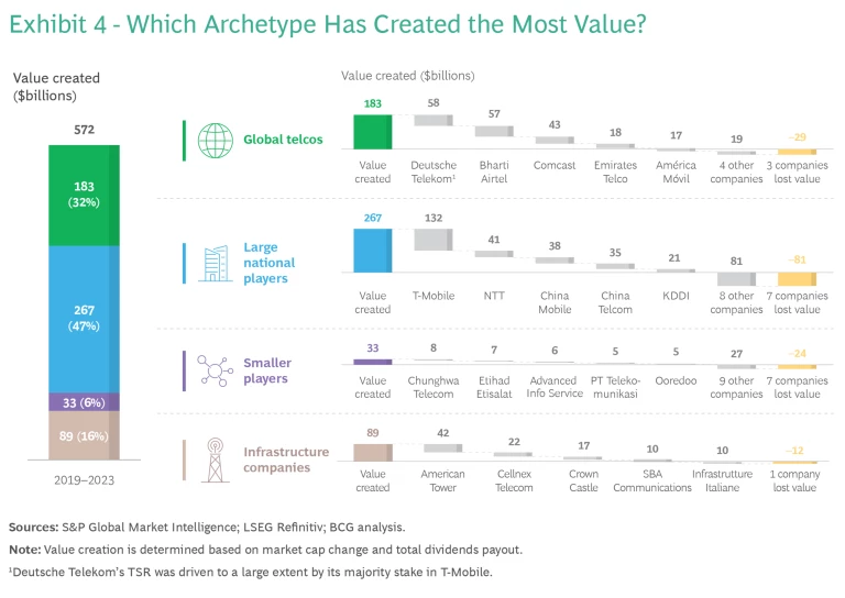 To get a clearer picture of where value in the telco industry is concentrated, we divide the industry into four archetypes: global telcos, large national players, smaller players, and infrastructure companies. (See Exhibit 4.) Each has used its own set of strategies for success.